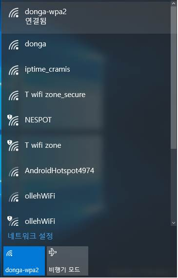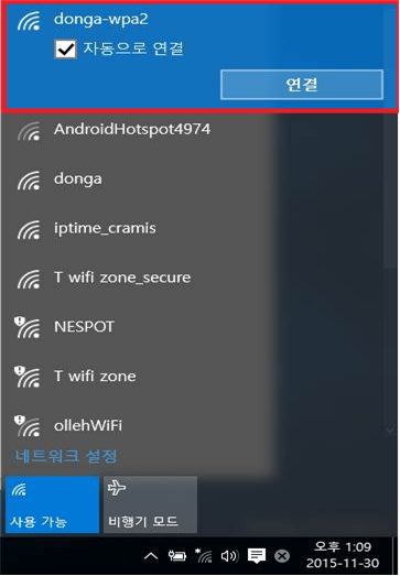 4. <그림4>무선네트워크 목록 중donga-wpa2’를 선택하여 [연결]을 클릭합니다.